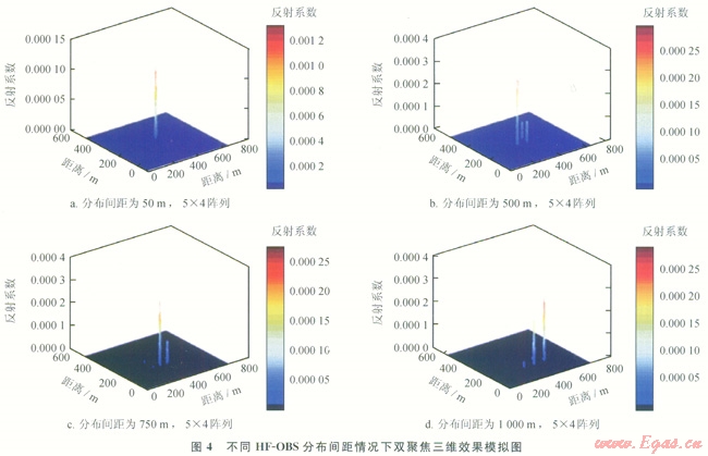 圖4為聚焦模擬效果圖。當HF-OBS分布間距為500m時,出現(xiàn)明顯旁瓣,但模擬震源的位置并未發(fā)牛變化(圖4-b);當分布間距為750m時,模擬震源的位置發(fā)生變化,成像效果明顯變差(圖4-c);當分布間距變小時,模擬成像效果愈來愈好(圖4-a)。