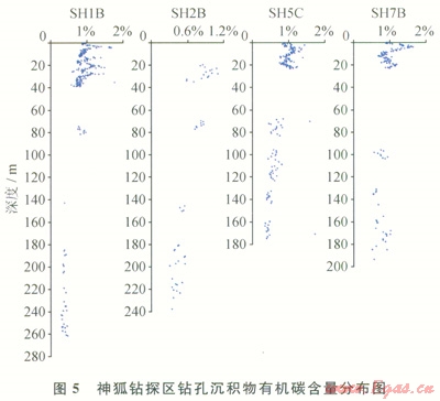 在南海北部陸坡淺表層沉積物有機(jī)質(zhì)中正構(gòu)烷烴基本為雙峰形,表現(xiàn)為海相浮游動物、陸源高等植物混合母源特征。神狐鉆孑L沉積物有機(jī)質(zhì)正烷烴為雙峰形分布特征(圖4)。第一主峰碳數(shù)為C17~C19,代表海相浮游動物和藻類,第二主峰碳數(shù)為C29或C31來源于陸源高等植物。其輕重?zé)N比值C21-/C22+介于0.06~5.73,有機(jī)質(zhì)d13C值為-17.3‰~-22.8‰,表明總體上以海相浮游動物和藻類為主,局部存在陸源有機(jī)質(zhì)。鉆孔沉積物TOC介于0.29%~1.77%,各鉆孔頂部層段TOC明顯表現(xiàn)出在高值區(qū)振蕩變化特征,并隨深度的增加TOC值逐漸降低,而到一定深度后,TOC基本保持穩(wěn)定(圖5)。這種有機(jī)碳系統(tǒng)地向下減少是早期成巖階段有機(jī)質(zhì)氧化分解的結(jié)果[17]。由于鉆孔淺部沉積物埋藏時間短,有機(jī)質(zhì)消耗較少,TOC與沉積物中原始含量比較接近,平均值達(dá)1.2%;而下部層段的有機(jī)碳為經(jīng)過早期成巖階段硫酸鹽還原和微生物發(fā)酵而大量消耗后的穩(wěn)定殘留有機(jī)碳,有機(jī)碳轉(zhuǎn)化率在30%~61%,大多轉(zhuǎn)化為生物甲烷氣,是形成水合物的主要?dú)怏w來源。神狐鉆孔沉積物有機(jī)質(zhì)中含有豐富的烷基苯系列化合物,以短鏈的烷基苯同系物優(yōu)勢為特征,含少量對熱演化敏感的較長鏈的烷基苯同系物,表明有機(jī)質(zhì)熱演化程度很低。此外,部分樣品中存在重排甾烷和4-甲基甾烷,是典型的微生物作用活動標(biāo)志,這與鉆探證實(shí)的水合物主要為微生物氣特征是一致的。