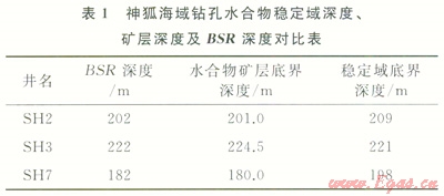 同樣,對神狐海域鉆探區(qū)穩(wěn)定域厚度進(jìn)行了計算,大量鉆探實(shí)測數(shù)據(jù)為穩(wěn)定域計算提供了準(zhǔn)確的參數(shù)。鉆探區(qū)熱流值為98.90~62.02mW/m2,在鉆探區(qū)內(nèi)8口先導(dǎo)孔均進(jìn)行了溫度測井和水深測量,在其中5個取心孔不同深度進(jìn)行了原位地層溫度測量,地溫梯度介于67.60~43.65℃/km。水合物甲烷含量超過99%,為I型水合物。計算結(jié)果表明,水合物穩(wěn)定域深度與BSR深度以及測井和取心揭示的水合物底界深度基本相符(表1)。鉆探區(qū)穩(wěn)定域厚度在80~224m,海底熱流變化對穩(wěn)定帶分布制約作用明顯,在SH2、SH3和SH7等3個井位附近,穩(wěn)定域厚度最大,也是熱流值最低的區(qū)域(66~75mW/m2)。