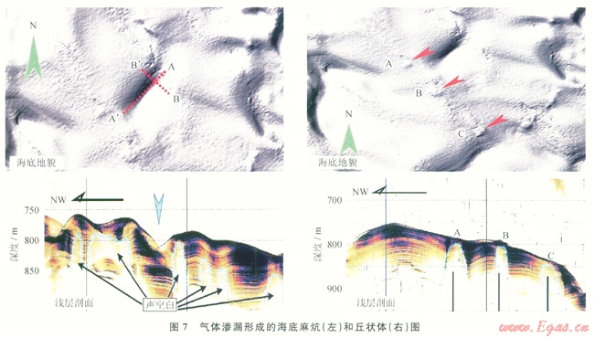 氣煙囪作為超壓流體泄壓的通道,將大量氣體運(yùn)移到淺部穩(wěn)定域中形成水合物礦藏,部分天然氣滲漏導(dǎo)致在海底形成冷泉噴口、麻坑、匠狀體、碳酸鹽巖匠等并引起海底微地貌的變化,在其周圍分布有大量如菌席、蠕蟲類、雙殼類等組成的以溢出天然氣為營養(yǎng)源的生物組合。例如,在南海東北部陸坡廣泛發(fā)育海底麻坑、丘狀體、自生碳酸鹽巖結(jié)殼等微地貌標(biāo)志(圖7),表明該區(qū)存在著大規(guī)模的海底滲漏現(xiàn)象。2004年中德合作SO177航次在該海域也發(fā)現(xiàn)了大量的結(jié)核狀、結(jié)殼狀或管狀白生碳酸巖鹽和典型的化能生物群落(雙殼類生物和管狀蠕蟲類及厭氧菌席)。