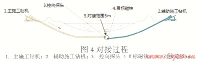 對接穿越需要在穿越曲線入、出土點兩端各架設一臺鉆機,在鉆桿短節(jié)內內安置感應探頭與目標磁鐵,兩臺鉆機分別進行導向孔頂進,當兩臺鉆機的鉆頭鉆至預定對接點,并且兩鉆頭距離在探測范圍內時,由入土點鉆機的探頭感應出土點鉆機鉆頭安裝的目標磁鐵發(fā)出的磁信號,兩臺鉆機械調操作,入土點鉆機鉆機,出土點鉆機回抽鉆桿,直至兩臺鉆機的導向孔完全吻合(如圖1)