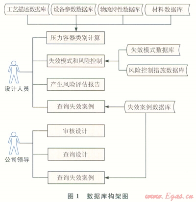 系統(tǒng)的設(shè)備工藝描述、設(shè)計(jì)參數(shù)、介質(zhì)特性、材料等基礎(chǔ)數(shù)據(jù)庫(kù)用于設(shè)計(jì)人員進(jìn)行壓力容器類別的計(jì)算,然后從失效模式數(shù)據(jù)庫(kù)、風(fēng)險(xiǎn)措施數(shù)據(jù)庫(kù)調(diào)用數(shù)據(jù)開(kāi)展失效模式和風(fēng)險(xiǎn)控制判別,參照失效案例,產(chǎn)生壓力容器設(shè)計(jì)階段的風(fēng)險(xiǎn)評(píng)估報(bào)告,提交公司主管領(lǐng)導(dǎo)審核。上級(jí)公司主管領(lǐng)導(dǎo)在系統(tǒng)中進(jìn)行審核,必要時(shí)也能方便地調(diào)用失效案例數(shù)據(jù)進(jìn)行復(fù)核(圖1)。