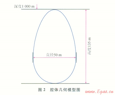 我國鹽巖礦藏以多夾層鹽巖為主,由于主要分析鹽穴儲(chǔ)氣庫溶腔在鹽巖蠕變下的變形規(guī)律,因此在建立儲(chǔ)氣庫溶腔模型時(shí)將復(fù)雜的鹽巖夾層簡化為簡單的單層鹽巖層。借鑒江蘇金壇鹽穴儲(chǔ)氣庫的建庫參數(shù)[4],建立了如圖2所示的腔體幾何模型。建立溶腔及圍巖地層模型后,將地層巖石力學(xué)參數(shù)、鹽層的蠕變關(guān)系、溶腔周圍的地應(yīng)力參數(shù)及溶腔運(yùn)行參數(shù)帶入模型中進(jìn)行模擬計(jì)算。