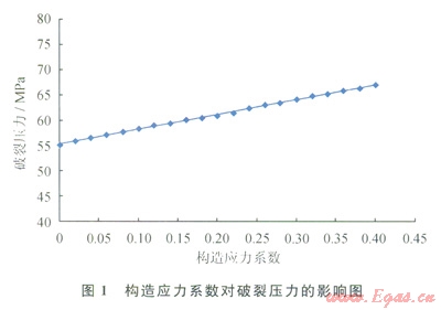圖1是構(gòu)造應(yīng)力與破裂壓力的關(guān)系。由圖1可見,隨著構(gòu)造應(yīng)力系數(shù)增加,破裂壓力呈線性增加。當(dāng)構(gòu)造應(yīng)力系數(shù)從0增加到0.4時(shí),破裂壓力從55MPa增加到67MPa,增幅達(dá)21.8%。元壩地區(qū)構(gòu)造處于強(qiáng)應(yīng)力作用區(qū),地層破裂壓力普遍偏高,如位于九龍山構(gòu)造帶南翼,毗鄰西北龍門山構(gòu)造帶強(qiáng)應(yīng)力區(qū)的YL2井須四段、YB6井須三段、YL6井須二段、YL10井須三段等,地層破裂壓力梯度為0.030~0.035MPa/m。其中,YL2井、YB6井在破裂壓力梯度大于0.030MPa/m下未能壓開地層。