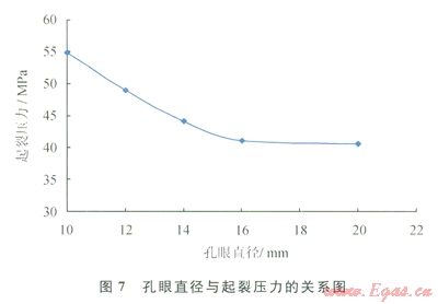 根據(jù)裂縫起裂壓力與射孔孔徑的關(guān)系(圖7) [7],裂縫起裂(破裂)壓力隨孔眼直徑的增加呈下降趨勢(shì)。因此,射孔時(shí)應(yīng)盡可能選擇較大直徑的射孔彈進(jìn)行射孔。但在相同的射孑L條件下,射孔孔徑越大,則射孔深度越小,為了兼顧射孔孔眼深度,元壩陸相井目的層射孔孔眼直徑多選擇在12~16mm范圍。