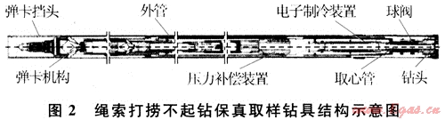 張永勤等[21]承擔的“十五”國家高技術(shù)研究發(fā)展計劃項目“深水深孔天然氣水合物保真取樣鉆具的研制”,分別研制了繩索打撈不起鉆保真取樣鉆具和投球起鉆式保壓取樣鉆具:①繩索打撈不起鉆取樣鉆具系統(tǒng)(圖2)主要由內(nèi)管總成、外管總成、鉆桿、打撈裝置、繩索絞車等組成,不起鉆可實現(xiàn)連續(xù)取心作業(yè)。齒條齒輪機構(gòu)使球閥旋轉(zhuǎn)90°,密封巖心容管。為了更可靠地保持水合物的原始狀態(tài),在鉆具結(jié)構(gòu)上設有蓄能壓力補償裝置。電子制冷裝置由保溫層和電子制冷器組成,保持樣品的溫度。繩索打撈不起鉆取樣技術(shù)具有勞動強度低、效率高、輔助肘間少等優(yōu)點,主要技術(shù)參數(shù)為:鉆孔直徑為174~190mm;巖心直徑為30~40mm;單次取心長度為3m。②投球起鉆式保壓取樣鉆具可直接連接到現(xiàn)有的石油鉆井鉆桿上進行鉆進取樣,但取樣時必須起出孔內(nèi)的全部鉆桿及鉆具,球閥關(guān)閉時采用泥漿作為動力介質(zhì),該鉆具與現(xiàn)有海洋石油鉆機配套鉆井施工時無需進行任何設備改造,利用現(xiàn)有的Ф114mm、Ф127mm、Ф140mm鉆桿即可鉆井施工。