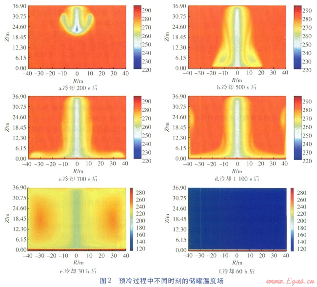 計(jì)算儲(chǔ)罐溫度場(chǎng)隨著時(shí)間的變化,儲(chǔ)罐溫度降至-150℃左右計(jì)算終止。預(yù)冷過程中不同時(shí)刻的儲(chǔ)罐溫度場(chǎng)見圖2,圖2中溫度單位均為K。