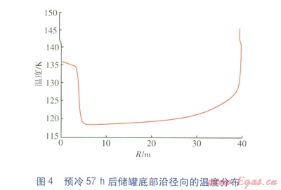點(diǎn)(0,0)處的溫度隨預(yù)冷時(shí)間的變化見圖3,預(yù)冷57h后儲(chǔ)罐底部沿徑向的溫度分布見圖4。從圖3可以看出,儲(chǔ)罐底部中心(即點(diǎn)(0,0)處)的溫度并不是隨著預(yù)冷過程的進(jìn)行而一直降低的,當(dāng)儲(chǔ)罐底部溫度降低到一定程度后,底部中心出現(xiàn)了溫度不降反升的現(xiàn)象。從圖4也可以看出,底部中心區(qū)域的溫度高于其他位置(除靠近側(cè)壁處)。這是因?yàn)閲娏艿囊旱蔚竭_(dá)儲(chǔ)罐底面后,在底面氣化,產(chǎn)生的氣體無(wú)法及時(shí)沿底面向四周擴(kuò)散,積聚在儲(chǔ)罐底部的中心區(qū)域,形成二次回流,二次回流阻礙了儲(chǔ)罐底面與內(nèi)部低溫氣體的對(duì)流換熱。同時(shí),底部的混凝土向內(nèi)部的導(dǎo)熱還在繼續(xù),因此在二次回流區(qū)出現(xiàn)了溫度不降反升的現(xiàn)象。隨著預(yù)冷的繼續(xù),底部混凝土的熱量充分釋放,液滴在儲(chǔ)罐底面處的氣化量減小,產(chǎn)生的新氣體量減少,二次回流區(qū)逐漸被壓縮,底部中心區(qū)域的溫度又重新下降。