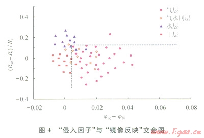 結(jié)合基于淡水鉆井液侵入特征分析以及聲波孔隙度和中子孔隙度的“鏡像反映”特征。通過(guò)引入“侵入因子”[(Rxo-Rt)/Rt],其中Rxo、Rt分別為中、深感應(yīng)測(cè)井值,建立“侵入因子”與“鏡像反映”(jac-jN)的交會(huì)圖,可以有效地識(shí)別氣水層(圖4)。