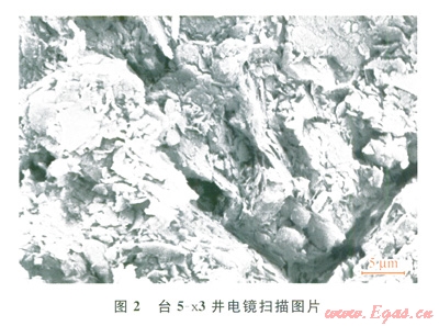 黏土礦物中以蒙脫石、伊蒙混層礦物以及伊利石的附加導(dǎo)電作用最為顯著,當(dāng)吸附陽(yáng)離子的數(shù)量(即巖石表面的陽(yáng)離子交換容量)較大時(shí),吸附陽(yáng)離子的附加導(dǎo)電作用非常顯著,可以使氣層電阻率明顯降低,甚至形成低阻氣層[7-10]。根據(jù)掃描電鏡資料(圖2),臺(tái)南氣田儲(chǔ)層中可分別識(shí)別出蒙脫石、伊一蒙混層、伊利石、高嶺石、綠泥石以及少量綠蒙混層等自生黏土礦物,它們分布于粒表或粒間。通過(guò)統(tǒng)計(jì)臺(tái)5-x3、臺(tái)6-x8、臺(tái)試x5等3口井各層位的黏土礦物相對(duì)含最發(fā)現(xiàn),臺(tái)6-x8蒙皂石平均含量11.9%,伊利石43%,臺(tái)試x5和臺(tái)5-x3井不含蒙皂石,但伊利石和伊/蒙混層均比較高,臺(tái)試x5井伊/蒙混層含量高達(dá)43.8%,伊/蒙混層和伊利石平均含量在54%以上,可能存在黏土附加導(dǎo)電作用。