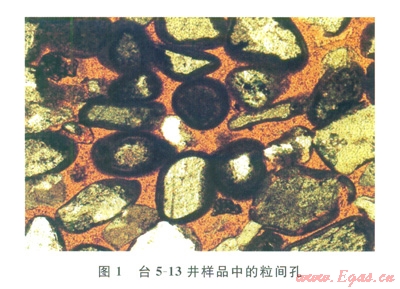 微觀孔隙的大小及其分布特征決定了束縛水飽和度的高低,同時(shí),由于親水性強(qiáng)的黏土礦物的填充進(jìn)一步改造了粒間孔隙,造成微孔隙的增加,巖石內(nèi)比面的增大,薄膜滯水增多,含水飽和度增加。臺(tái)南氣田儲(chǔ)層孔隙類以原生孔隙為主,僅有少量的次生孔隙。原生孔隙主要為原生粒間孔,其次為雜基內(nèi)微孔;次生孔隙主要為溶孔,有少量裂縫發(fā)育。通過(guò)臺(tái)5-x3及臺(tái)試x5井鑄體薄片(圖1)對(duì)孔隙類型的統(tǒng)計(jì)表明,發(fā)現(xiàn)孔隙結(jié)構(gòu)中84.78%為粒間孔,13.04%為微裂縫;喉道類型以縮頸型喉道為主,少量微喉道,孔徑分布一般在0.1~1mm之間,面孔率在1%~15%之間。分析表明,臺(tái)試5井孔隙以粒間孔為主,孔隙半徑比較細(xì),微孔隙比較發(fā)育,發(fā)育少量微裂縫。