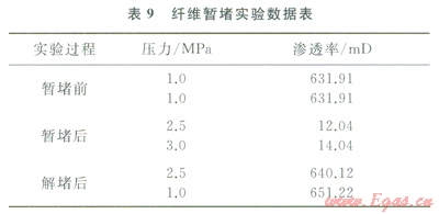 通過(guò)試驗(yàn)數(shù)據(jù)(表8)可以看到,在60℃以上,纖維在鹽酸中能夠很好地降解。暫堵后,纖維能夠顯著降低巖心的滲透率,通過(guò)酸化解堵,巖心滲透率能夠完全恢復(fù)(表9)。