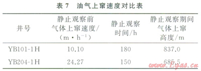 元壩氣田在YB101-1H、YB204-1H井投產(chǎn)中進(jìn)行了試驗(yàn),在YB101-1H靜止觀察前測(cè)得氣體上竄速度為10.1m/h,靜止觀察180h后,氣體上移距離837m;在YB204-1H井中靜止觀察前測(cè)得氣體上竄速度為24.27m/h,靜止觀察150h后,氣體上移距離685.5m,氣體上竄速度均沒(méi)有明顯增加,驗(yàn)證了氣體在壓井液中的運(yùn)行規(guī)律(表7)。實(shí)踐證明,通過(guò)短起下測(cè)油氣上竄速度能夠滿足下完井投產(chǎn)管柱的井控需要。