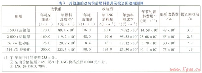 對于柴油—LNC雙燃料船舶,LNG替代約70%的燃油時(LNG替代率為70%)發(fā)動機運行穩(wěn)定,即LNG與柴油使用比例(質(zhì)量比)約為7:3。根據(jù)柴油—LNG雙燃料船舶運行經(jīng)驗數(shù)據(jù)可知,船舶油改氣后預計能節(jié)約16%~20%的燃料成本,運營企業(yè)的贏利能力將因此大大增強。