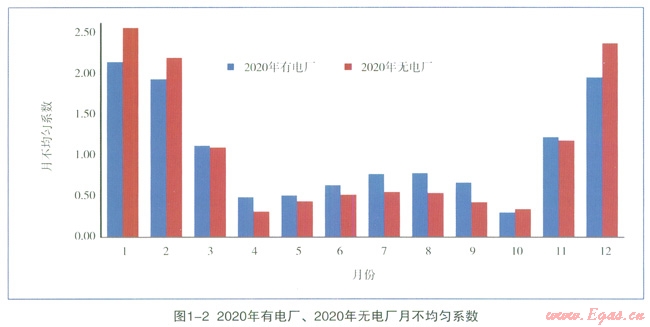 計算表明:預(yù)計到2020年,“有電廠”的最大月不均勻系數(shù)為2.05,“無電廠”為2.45,“有電廠”的最大月不均勻系數(shù)最小,“峰值”與“均值”的偏離程度最小,如圖1所示。