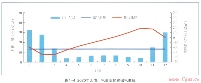 2020年有電廠、2020年無電廠兩種情況供氣曲線、用氣曲線、儲氣設(shè)施工作曲線合成圖分別如圖1-3、1-4所示,圖中供應(yīng)曲線、用氣曲線對應(yīng)左側(cè)縱坐標(biāo),儲氣曲線對應(yīng)右側(cè)縱坐標(biāo)。用氣曲線代表負(fù)荷的逐月變化情況,供氣曲線代表氣源在一年內(nèi)連續(xù)均勻供氣,儲氣曲線代表自計算開始時算起天然氣供應(yīng)量累計值與用氣量累計值之差。