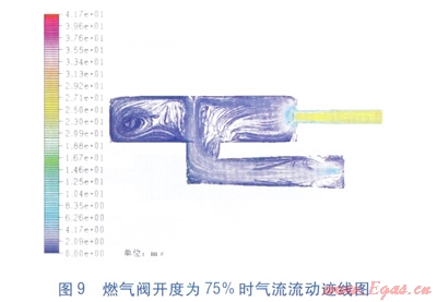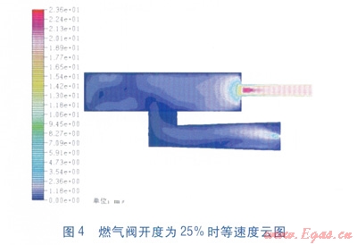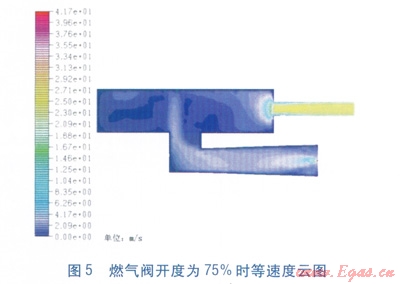 利用FLUENT軟件對(duì)比模擬了燃?xì)忾y開度為25%和75%兩種條件下?tīng)t腔內(nèi)的氣體流動(dòng)狀態(tài)。計(jì)算得出兩種狀態(tài)下整個(gè)爐腔內(nèi)氣流的最高流速分別為24.61m/s和46.86m/s。高速流主要出現(xiàn)在爐腔排氣導(dǎo)管。