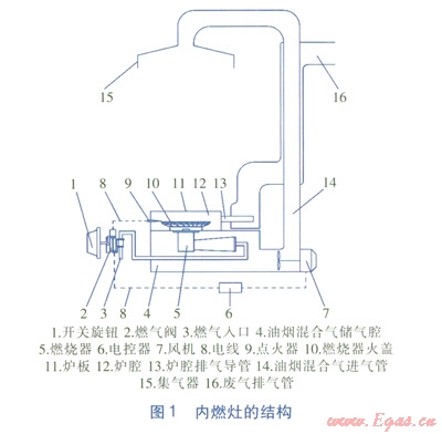 內(nèi)燃灶的結(jié)構(gòu)見(jiàn)圖l。工作時(shí),空氣連同炊事產(chǎn)生的油煙、水蒸氣通過(guò)風(fēng)機(jī)壓送到封閉的爐腔內(nèi),燃?xì)庠谧陨韷毫ψ饔孟逻M(jìn)入燃燒器,并在高于大氣壓的條件下燃燒,加熱爐板,爐板可直接加熱食物或其他烹飪炊具;高溫廢氣在排出的過(guò)程中加熱油煙混合氣進(jìn)氣管內(nèi)的氣體,減少?gòu)U氣余熱的浪費(fèi),提高系統(tǒng)熱效率[5]。