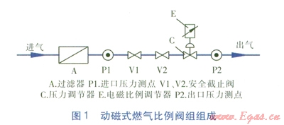 動磁式燃氣比例閥組(適用于大氣式燃燒方式)組成見圖l,由兩級安全截止閥、動磁式燃氣比例閥(由電磁比例調(diào)節(jié)器、壓力調(diào)節(jié)器構(gòu)成,以下簡稱比例閥)組成。當燃氣進入閥組時,先經(jīng)過濾器、兩級安全截止閥,再進入比例閥。比例閥前后設(shè)有進出l5壓力測點。