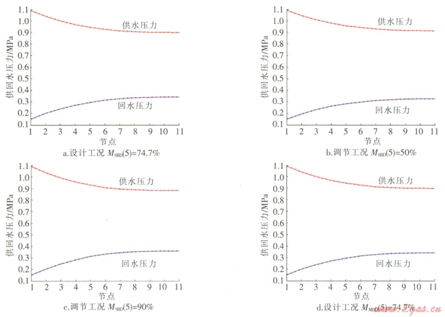 以用戶5所在支路上的閥門調(diào)節(jié)為例,對(duì)閥門相對(duì)開度為50%、90%及74.7%(設(shè)計(jì)工況下的閥門相對(duì)開度)的水力工況進(jìn)行分析比較。SBD工況的閥門相對(duì)開度用MSBD表示,MDD工況的閥門相對(duì)開度用MMDD表示。兩種運(yùn)行方式下不同閥門相對(duì)開度時(shí)的供回水壓力見圖4。