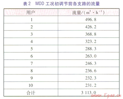 MDD工況初調(diào)節(jié)前各支路的流量見表2。MDD工況下,初調(diào)節(jié)前管網(wǎng)總流量為3113m3/h.遠(yuǎn)遠(yuǎn)超出設(shè)計(jì)流量(1000m3/h),近端用戶的水力失調(diào)度為4.97,出現(xiàn)嚴(yán)重的水力失調(diào),這樣長(zhǎng)時(shí)間運(yùn)行下去,不僅管網(wǎng)壓力很高,而且水泵超負(fù)荷運(yùn)行,造成能源的極大浪費(fèi)。