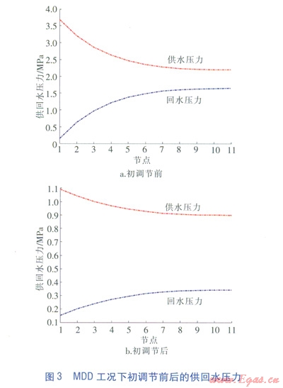 管網(wǎng)采用末端定壓差的方式,定壓差為556.96kPa。初調(diào)節(jié)前近端用戶資用壓頭約為3550kPa,是末端用戶資用壓頭的7倍。MDD工況初調(diào)節(jié)前后的供回水壓力見圖3。