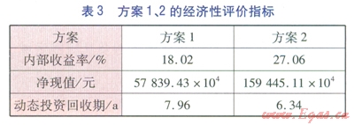本文采用內(nèi)部收益率(稅前)、凈現(xiàn)值(稅前)、動態(tài)投資回收期(稅前)作為方案經(jīng)濟(jì)性評價指標(biāo)。內(nèi)部收益率的經(jīng)濟(jì)含義是項目在其壽命期內(nèi)未回收資金的預(yù)計收益率,項目投入運營后,投資額將通過每年所產(chǎn)生凈效益的形式逐步得到回收。已回收部分將用于再投資,未回收部分待繼續(xù)回收,內(nèi)部收益率就是指未回收部分的收益率,因此稱為內(nèi)部收益率。凈現(xiàn)值的經(jīng)濟(jì)含義是項目在其壽命期內(nèi)預(yù)計創(chuàng)造的全部凈效益。內(nèi)部收益率、凈現(xiàn)值都是反映項目贏利能力的指標(biāo),前者體現(xiàn)的是相對贏利能力,后者體現(xiàn)的是絕對贏利能力。內(nèi)部收益率、凈現(xiàn)值越大,項目贏利能力越強(qiáng)。動態(tài)回收期越短,說明項目收回投資額的時間越短。方案1、2的經(jīng)濟(jì)性評價指標(biāo)見表3。由表3可知,方案2的內(nèi)部收益率、凈現(xiàn)值均高于方案l,且方案2的動態(tài)投資回收期短于方案l,這說明方案2的經(jīng)濟(jì)性優(yōu)于方案l。