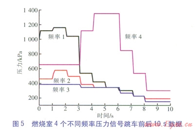 燃燒室4個不同頻率壓力信號跳車前后10s數(shù)據(jù)如圖5所示,這4個壓力信號表征燃燒室火焰振蕩特征頻段的強度。頻率l、頻率2、頻率3、頻率4代表頻率依次降低。從圖5可以看出,在2s左右,高頻段頻率1、頻率2的值突降,圖3和圖4中7號燃燒室的溫度也突然降低;3s左右,高頻段強度進一步降低,低頻段信號頻率4突然增強,7號燃燒室的溫度也再次下降;4s左右,這一趨勢進一步加強,7號燃燒室溫度也進一步降低;6s以后,所有頻段的信號強度都減弱,這是因為主、輔燃料閥都已經(jīng)關(guān)小,燃燒室功率下降。從以上變化趨勢可以看出,火焰高頻振動減弱、低頻振動加強代表燃燒不穩(wěn)定的增強,最后導(dǎo)致火焰被吹滅,燃燒室溫度下降。該廠現(xiàn)場操作人員也反映,燃氣輪機運行過程中除了正常的運行噪聲外,還有周期性的轟隆聲,這些外部表現(xiàn)與燃氣輪機熱聲振蕩燃燒現(xiàn)象非常相似。周期性的燃燒不穩(wěn)定,并且出現(xiàn)較大振幅的壓力波動,這種現(xiàn)象通常稱為熱聲振蕩燃燒。