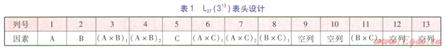 除了因素孤立地影響試驗結果外,還存在因素間不同水平聯(lián)合對試驗結果產生影響。為考察土壤厚度、植物高度和LAI這三個主要因素及各主要因素間的交互作用對試驗結果影響的顯著程度,本正交試驗選用L27(313)表,其表頭設計見表1,L27(313)中的27指試驗次數為27次,3代表每個因素的水平個數為3,13代表可安排的因素為13個。表1中,(A×B)代表A與B兩因素的交互作用,(A×B)1、(A×B)2作為其交互作用的兩個因素,用于判斷A與B的不同水平組合時產生的交互作用大小,(A×C)、(B×C)意義與(A×B)相同;空列用于判斷試驗的誤差。