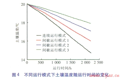 不同運行模式下土壤溫度隨運行時間的變化見圖4。由圖4可知,熱泵機組運行時土壤溫度逐漸下降,下降幅度與地埋管換熱器的運行模式有關。連續(xù)運行模式下,到供暖末期,土壤溫度由初期的20℃降為14.72℃,降幅達5.28℃。間歇運行模式1下,到供暖末期,土壤溫度為16.01℃,降幅為3.99℃。間歇運行模式2下,到供暖末期,土壤溫度為l7.08℃,降幅為2.92℃。間歇運行模式3下,到供暖末期,土壤溫度為17.91℃,降幅為2.09℃。由以上分析可知,當日開停比減小時,地埋管換熱器運行時間減少,從土壤提取的熱量減少,土壤溫度下降幅度減小。但由于每天的恢復時間較短,不足以使土壤溫度有明顯的改變。