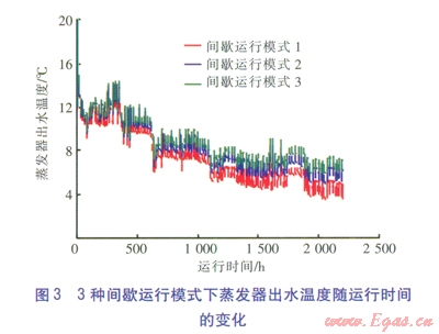 3種間歇運行模式下蒸發(fā)器出水溫度隨運行時間的變化見圖3。由圖3可知,3種間歇運行模式下蒸發(fā)器出水溫度的下降幅度均小于連續(xù)運行模式。對于間歇運行模式l,蒸發(fā)器最低出水溫度為3.49℃,高于連續(xù)運行模式,但仍然低于蒸發(fā)器出口溫度推薦范圍的下限,整個供暖期蒸發(fā)器出水溫度低于5℃的時間約260h。對于間歇運行模式2,蒸發(fā)器最低出水溫度為4.95℃,高于間歇運行模式l,而間歇運行模式3的蒸發(fā)器最低出水溫度為5.86℃。因此,日開停比越小,熱泵機組的運行工況越好。