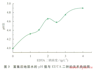 按培養(yǎng)基工的配方向地層水中加入各營(yíng)養(yǎng)物質(zhì)后,分別向各瓶地層水中添加金屬離子絡(luò)合劑EDTA二鈉,使其在地層水中的濃度分別為0、1.0g/L、l.5g/L、2.0g/L、2.5g/L、3.0g/L、4.0g/L;調(diào)節(jié)各瓶地層水的初始pH值在7.0左右,然后在35℃下富集地層水中發(fā)酵產(chǎn)氫菌4d;調(diào)節(jié)富集后地層水菌液的pH值為6.0左右,連接好產(chǎn)氣裝置,研究不同梯度EDTA二鈉對(duì)產(chǎn)氫的影響。
