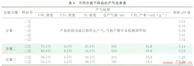 產(chǎn)氫廢料的產(chǎn)甲烷反應(yīng)啟動(dòng)較慢,大約在第35天才開始有氣體產(chǎn)生,且產(chǎn)氣速率遠(yuǎn)比產(chǎn)氫階段要慢,持續(xù)時(shí)間較長(zhǎng),直到第55天后才停止產(chǎn)氣。第65天測(cè)試各個(gè)集氣瓶中的氣體組分(表4)。所有樣品中均未檢測(cè)到氫氣。