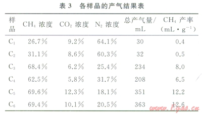 單獨(dú)發(fā)酵產(chǎn)甲烷工藝大約在第15天后才開始有甲烷產(chǎn)生,產(chǎn)氣持續(xù)時(shí)間約為30d,本實(shí)驗(yàn)于第35d測(cè)試各樣品的產(chǎn)氣結(jié)果(表3)。