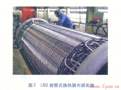 LNG繞管式換熱器用于天然氣液化工藝,這種換熱器是在芯筒與外筒之間的空間內(nèi)將換熱管按螺旋線形狀交替纏繞而制成的,相鄰兩層螺旋狀換熱管的螺旋方向相反,并且采用隔條來保持一定的間距。繞管式換熱器剖面見圖1,LNG繞管式換熱器內(nèi)部實物見圖2[1]。