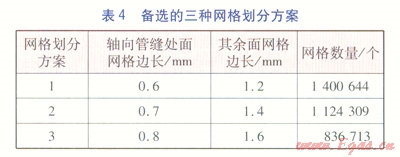 使用ANSYS ICEM CFD軟件對物理模型進行網(wǎng)格劃分,采用非結構化網(wǎng)格,先對面生成網(wǎng)格,進而自適應生成體網(wǎng)格。在整個模型中,纏繞管的軸向管縫寬1.94mm,為最小的幾何尺度,故以此作為面網(wǎng)格的劃分依據(jù),備選的三種網(wǎng)格劃分方案見表4。另外,為了精確計算摩擦壓力降和表面?zhèn)鳠嵯禂?shù),特在三層纏繞管的壁面處設置較細的邊界層,邊界層起步厚度為0.005mm,增長因子為1.2,共計10層邊界層。