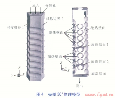 對于殼側36°物理模型,流體從頂部3個分流孔流入,從底部端面流出,兩側剖面為對稱邊界,中間纏繞層底部4列為加熱壁面,其余壁面均為固定無滑移絕熱壁面,模型邊界條件見表2,輸入的參數(shù)見表3。表3中的參數(shù)值與AUNAN的實驗數(shù)據(jù)8[180-187]相一致。