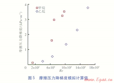 根據(jù)已建立的物理模型,使用ANSYS FLUENT軟件分別對AUNAN的甲烷、乙烷過熱氣流動實驗數(shù)據(jù)(見表3)進行了數(shù)值模擬,模擬具體設置見表6。在來流進入殼側流道之后,以圖4中的流道截面1和2作為計算數(shù)據(jù)獲取位置,摩擦壓力降梯度與表面?zhèn)鳠嵯禂?shù)(本文中的表面?zhèn)鳠嵯禂?shù)均指4個加熱壁面處的平均表面?zhèn)鳠嵯禂?shù))模擬計算值見圖5和圖6,模擬計算值與實驗值之間的相對誤差見圖7和圖8。在圖5~8中,雷諾數(shù)(Re)和摩擦壓力降梯度(Dp)的定義分別如下: