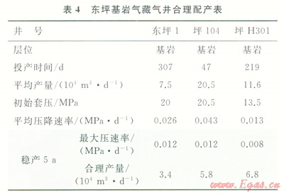 東坪1井區(qū)基巖層試采井有3口,實際單井日產(chǎn)氣12×104~18×104m3,壓降速率為0.026~0.038MPa/d。平均單井日產(chǎn)氣7.8×104~19.8×104m3,壓降速率0.016~0.029MPa/d。該井區(qū)基巖層試采產(chǎn)量較高,壓力高,也說明基巖儲層物性好。