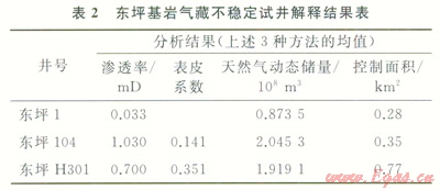 通過對3口井不穩(wěn)定試井解釋結(jié)果的統(tǒng)計表明(表2),各井控制儲量、控制面積、滲透性等在不同井段和井區(qū)差異較大,同樣說明基巖內(nèi)部的非均質(zhì)性較強。