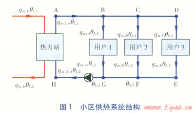 小區(qū)供熱系統(tǒng)結(jié)構(gòu)見圖l。小區(qū)供熱系統(tǒng)劃分為3個部分:熱力站、二級管網(wǎng)、用戶。