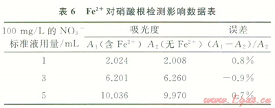 分別按不同比例配制NO3-標(biāo)準(zhǔn)液和Fe3+標(biāo)準(zhǔn)液的混合液,然后根據(jù)標(biāo)準(zhǔn)方法進(jìn)行硝酸根的檢測,實(shí)驗(yàn)結(jié)果如表5所示。
