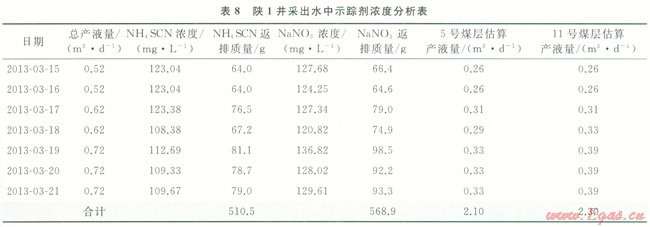2012年12月對陜1井進(jìn)行了分層壓裂施工,11號煤壓裂注入壓裂液1153m3,加入NaNO3 500kg,示蹤劑NaNO3在單層壓裂液中的平均濃度約為430mg/L;5號煤壓裂,注入壓裂液1135m3,加入NH4SCN 500kg,示蹤劑NH4SCN在單層壓裂液中的平均濃度約為440mg/L。壓裂施工完成后,于2013年3月10日開始進(jìn)行排采,2013年3月15日開始連續(xù)一周每天取樣進(jìn)行室內(nèi)檢測,按照前面實(shí)驗(yàn)室分析方法分析SCN-和NO3-測得采出水中兩種示蹤劑的含量如表8所示。