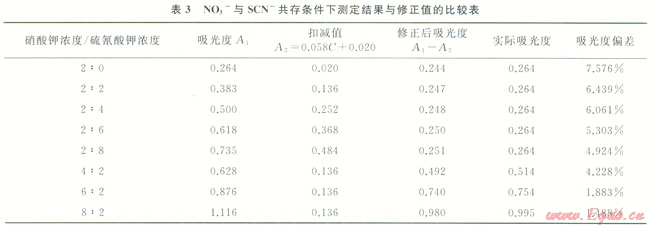 由表3可知,NO3-吸光度經(jīng)修正后,總體偏低,但誤差可控制在7.576%范圍內(nèi)。該修正方法降低了SCN-對NO3-測量的影響。