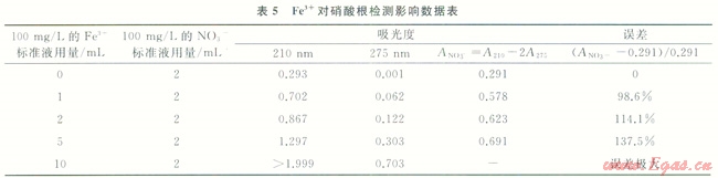 由表5結(jié)果表明:不加Fe3+時(shí),NO3-標(biāo)準(zhǔn)液因不含有機(jī)物,在275nm處幾乎無吸收,加入Fe3+標(biāo)準(zhǔn)液后,溶液在210nm、275nm處吸光度明顯提高,這說明Fe3+在210nm、275nm處均有強(qiáng)烈吸收,對NO3-的測定結(jié)果影響較大,能使測定結(jié)果大大增加。