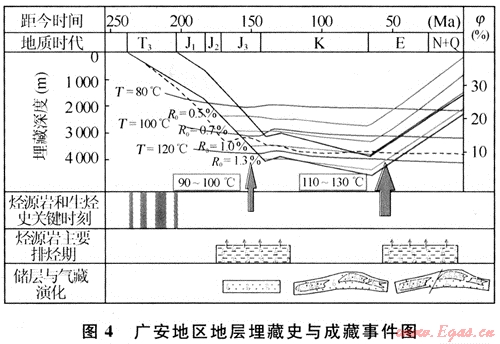 首先,根據(jù)廣安地區(qū)的埋藏與生烴史演化,晚侏羅世至早白堊世,地層溫度達(dá)到100~120℃,Ro達(dá)到了1.0%~1.3%,須家河組煤系源巖處于最大生烴期,并發(fā)生了排烴。但是,以煤系為主的烴源巖具有較強(qiáng)的吸附烴能力,吸附狀態(tài)的甲烷占55.83%~95.63%,成為甲烷在煤層中的主要儲(chǔ)存形式。等溫吸附實(shí)驗(yàn)表明,當(dāng)?shù)貙訅毫档蜁r(shí)會(huì)有大量煤層氣發(fā)生脫吸附作用,成為游離氣,通過(guò)煤層割理或裂縫系統(tǒng)進(jìn)入儲(chǔ)集層[15~16]。因此,在地層埋藏大量生烴過(guò)程中,烴源巖并沒(méi)有發(fā)生完全排烴,而是有很多烴類(lèi)被吸附在煤系地層中,在后期的抬升降溫過(guò)程中發(fā)生大量排烴。