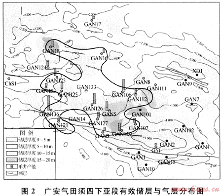 從廣安須四、須六段氣藏的平面與縱向分布特征可以看出,廣安氣田氣藏的分布范圍主要受有效儲(chǔ)層的控制,不受構(gòu)造起伏的影響,屬于巖性或構(gòu)造巖性氣藏。但構(gòu)造高點(diǎn)與有效儲(chǔ)層的配合可以提高產(chǎn)能。須六段氣藏雖然分布在廣安構(gòu)造高部位及其斜坡,主要與其有效儲(chǔ)層的分布范圍相一致,而有效儲(chǔ)層的形成主要受儲(chǔ)層沉積和成巖演化的控制。須四段氣藏的分布則基本不受構(gòu)造起伏的控制,由圖2可以看出,有效儲(chǔ)層同樣分布的東部是構(gòu)造高部位,但沒(méi)有氣層分布。而西部構(gòu)造地勢(shì)低洼,則是氣層分布的主要范圍。