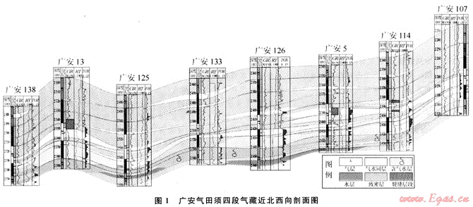廣安氣田含氣層系主要為須四段和須六段,其疊加起來(lái)的探明儲(chǔ)量超過(guò)了1300×108m3,含氣回積達(dá)到了800km2,但由于儲(chǔ)層低孔低滲,成巖作用強(qiáng)烈,導(dǎo)致儲(chǔ)層和致密砂巖間互分布[6~7]。致密砂巖的排替壓力高,成為氣藏內(nèi)部的分割層,從而將須四段和須六段氣藏在縱向和橫向上分割成數(shù)個(gè)小氣藏,它們相互獨(dú)立,具有不同的氣水和溫壓系統(tǒng),是川中地區(qū)大面積成藏的典型代表。