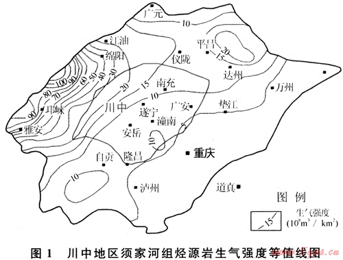 川中地區(qū)須家河組為一套自生自儲的氣藏,須一段、須三段、須五段暗色泥巖層夾煤層是主要烴源巖,源巖中有機(jī)質(zhì)極為豐富,具有形成大氣田的物質(zhì)基礎(chǔ);烴源巖厚度較大,暗色泥質(zhì)源巖厚度超過100m;烴源巖總厚度一般超過130m,局部地區(qū)大于300m,煤巖總厚度超過3m,具多層分布的特點,部分井可達(dá)數(shù)層,煤巖單層厚度為0.2~1m;烴源巖有機(jī)碳豐度普遍較高,平均為1.76%,以腐殖型干酪根為主,川中地區(qū)發(fā)育最好的3套烴源以須五段最好,須三段次之,須一段厚度較薄。盡管川中地區(qū)每套烴源巖生氣強(qiáng)度偏低,平均生氣強(qiáng)度為12.1×108m3/km2(圖1),但其烴源巖厚度較大、有機(jī)質(zhì)含量高、分布范圍大、構(gòu)造平緩、中深埋藏、保存條件良好,為須二、須四、須六段天然氣富集成藏提供了豐富的物質(zhì)基礎(chǔ),具備形成大中型氣藏的氣源條件。