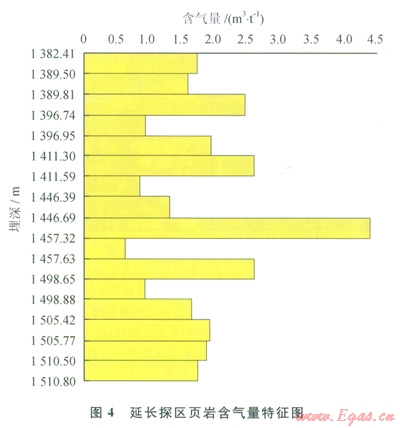 與常規(guī)天然氣類似,要構(gòu)成一定的儲(chǔ)量規(guī)模,頁巖氣必須具備充足的氣源條件,但這并不意味著其氣源條件狹窄,對(duì)地質(zhì)、地球化學(xué)等指標(biāo)仍有定量上的要求。在頁巖規(guī)模確定的前提下,含氣量的大小是決定探區(qū)是否具有商業(yè)開采價(jià)值的關(guān)鍵。含氣量的大小一方面受控于儲(chǔ)集空間的發(fā)育程度,另一方面受控于烴源巖的生氣能力,而最終決定頁巖生氣能力的是有機(jī)質(zhì)的豐度、類型和成熟度。有機(jī)質(zhì)的豐度、類型和成熟度在一定程度上具有生氣互補(bǔ)性,例如腐泥型母質(zhì)在熱演化程度較低時(shí)也可以生氣,而腐殖型母質(zhì)在高演化程度下才可能生成同等的氣量[3]。同理,含氣量的大小是各種地球化學(xué)參數(shù)指標(biāo)綜合作用的結(jié)果。延長(zhǎng)探區(qū)內(nèi)1井與2井具有相同的母質(zhì)類型(以混合型為主),但l井的有機(jī)碳含量為2.2%,鏡質(zhì)體反射率為0.88%,孔隙度為0.25%;而2井的有機(jī)碳含量為3.9%,鏡質(zhì)體反射率為1.0l%,孔隙度為0.11%,孔隙度極小。然而,2口井頁巖的含氣量卻大致相當(dāng)(均接近3.5m3/t)。由此可見,地球化學(xué)指標(biāo)上的差異并不代表頁巖整體含氣性的差異,當(dāng)某個(gè)地球化學(xué)指標(biāo)條件差時(shí),若其他指標(biāo)較好仍可能具有可觀的含氣量。因此,在進(jìn)行頁巖氣地質(zhì)評(píng)價(jià)時(shí),不能采用單一的地球化學(xué)指標(biāo)來進(jìn)行判別。